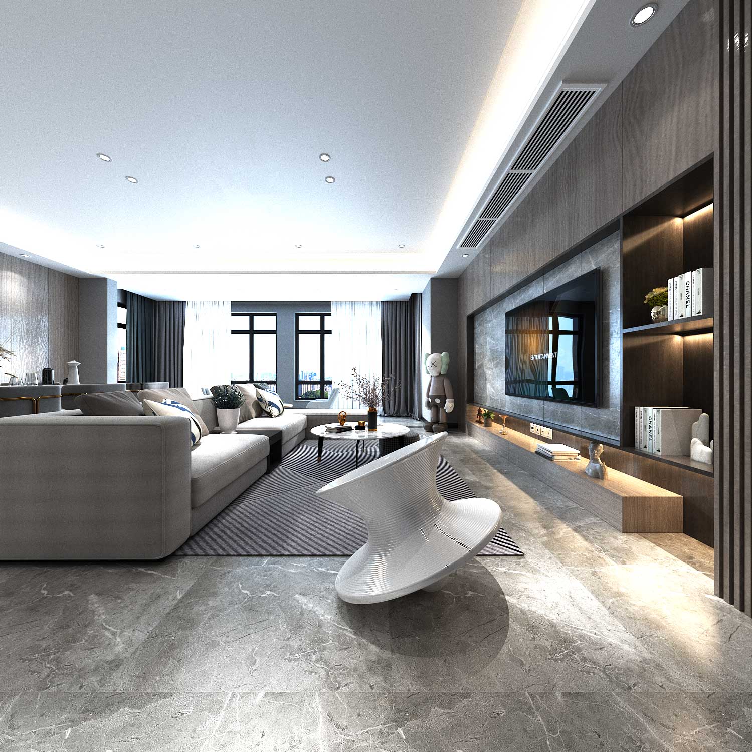 在客厅的设计上,我们放弃完了传统背景墙,采用超大面的科定木饰面进行装饰,电视柜局部采用灰色的岩板进行点缀,石材外挂电视做法,潮流的kwas装饰物提升空间潮品感,现代风格的家具展示出空间的时尚大气。